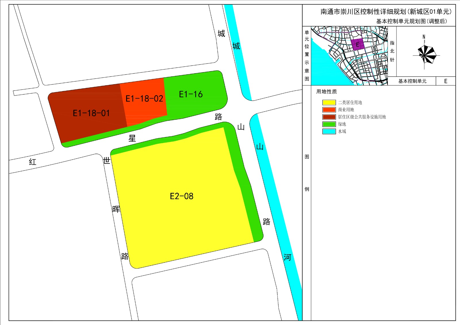 3、将E2-08地块南侧及西侧“L”型道路宽度由18米调整至15米,将E1-18地块北侧及西侧规划道路分别由7米、13米拓宽至15米,红星路北侧绿化带宽度由20米调整为10米。