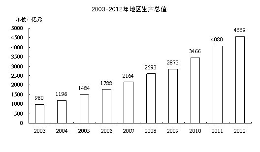 初步核算,全市生产总值4558.7亿元,按可比价计算,比上年增长11.8%。其中,第一产业增加值319.1亿元,增长4.6%;第二产业增加值2414.1亿元,增长12.4%;第三产业增加值1825.5亿元,增长12.3%。人均地区生产总值62506元,按当年平均汇率折算达9902美元,按可比价计算,比上年增长11.7%。财政总收入占地区生产总值的比重达23.2%。