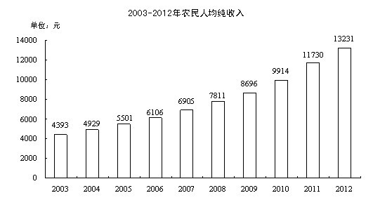 全年农村居民人均纯收入13231元,比上年增长12.8%;人均生活消费支出9839元,比上年增长15.6%。年末农村居民人均住房面积