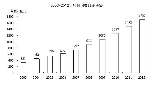 全年社会消费品零售总额1708.7亿元,增长15.5%。其中,城市消费品零售额1233.1亿元,增长15.8%;农村消费品零售额475.6亿元,增长14.7%。分行业看,批发和零售业消费品零售额1576.3亿元,增长15.2%;住宿和餐饮业消费品零售额132.3亿元,增长20.0%。