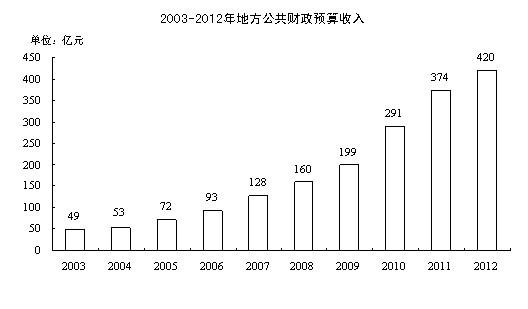 全年财政总收入1055.9亿元,增长11.0%,其中,各项税收567.8亿元,增长10.7%。地方公共财政预算收入419.7亿元,增长12.3%,其中,营业税增长56.5%,增值税下降0.1%。全年财政总支出937.6亿元,增长23.0%,其中,地方公共财政预算支出513.0亿元,增长22.3%。地方公共财政预算支出中,用于社会保障与就业、科学技术、教育、医疗卫生、环境保护民生方面的财政投入达285.2亿元,增长23.6%。