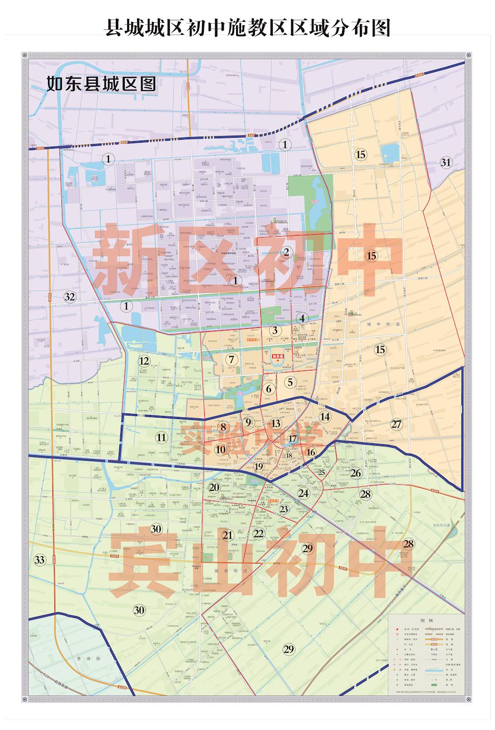 (2)如东县新区初中(如东县实验中学城北校区):区块1、2、3、4、5、6、7、12、15、31、32。东至九总(含丁杨村、潮墩村、如华村、八总村、六总村分乡河以东组别等),西至环北(含肖桥村、江庄村、虹元村、陈高村等),南至珠江路、东环路、掘坎河,北至北场村、振新社区(不含凤阳村、金凤村)等。